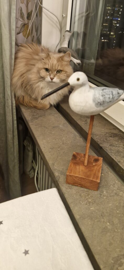 4:e December. Torsdag Jobba. Vi tar lunchen på Sonesson. Promenerar längs Tommarpsån och ser att de är klara med en av de nya broarna. IW. En katt tittar genom fönstret på oss.